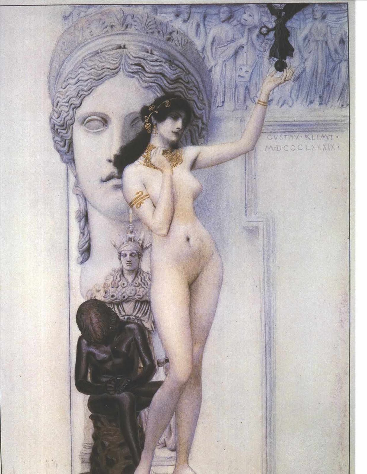 Image: ‘Allegory of sculpture’ (Allegorie der Skulptur) an 1889 painting (signed towards the top right of the work as ‘Gustav Klimt MDCCCLXXXIX’, or 1889) by leading Viennese artist Gustav Klimt (1862-1918), image scanned from an art catalogue.